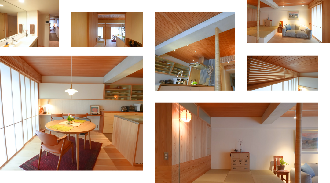 築約40年のマンションのリノベーション事例。床や壁に国産のスギを使用。他にも無垢の木が豊富にあしらわれ、ぬくもりある空間に生まれ変わりました。