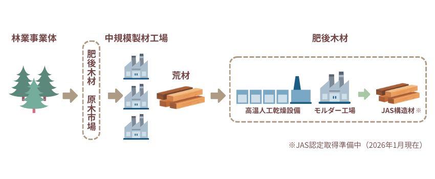 熊本県は全国有数のスギ・ヒノキの生産量を誇る林業県であると同時に大きな木材消費地でもあります。その熊本県の木材流通拠点として一翼を担っている肥後木材株式会社は令和5年度熊本県林業・木材産業生産性強化対策事業補助金を活用し、人工乾燥設備・モルダー加工設備を導入。モルダー工場棟および養生用のATAハイブリッド構法木造建屋2棟(984㎡・948㎡)の建設にあたっては令和6年度のJAS構造材実証支援事業を活用、地域の中小の製材工場と連携し荒材を仕入れて乾燥加工、モルダー加工を行い、自社オリジナルのKD材製品として出荷する体制を整えました。現在、JAS認証に向け準備しており、JAS構造材の県内外への安定供給の実現を目指しています。