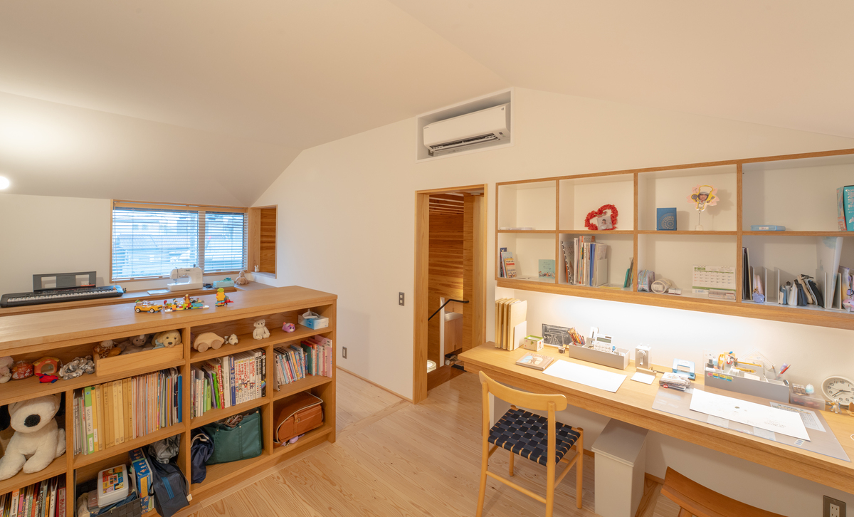 2階の子ども部屋は壁と天井を白い漆喰にしてカジュアルな雰囲気に