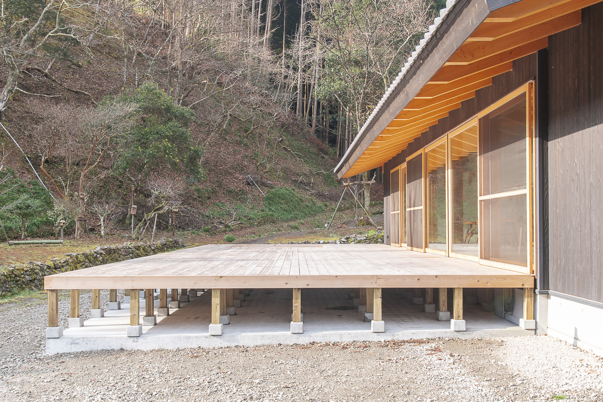高知の山間に現れた、自然風景に溶け込む広大なウッドデッキ