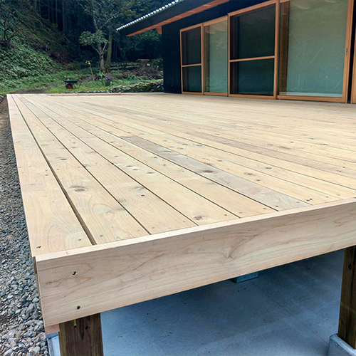 地元のスギとヒノキでつくった堅牢なウッドデッキ