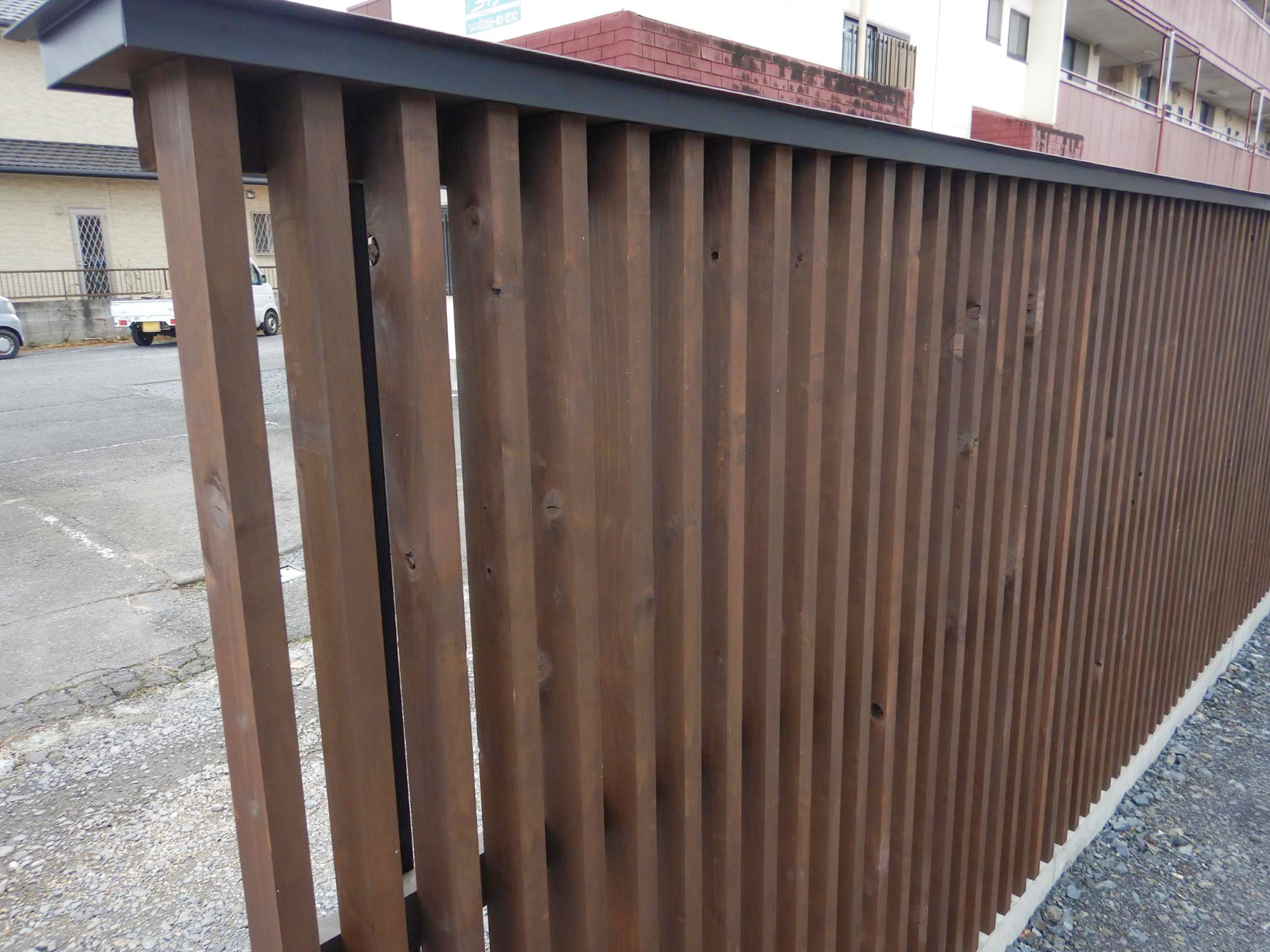 使用するヒノキ材には全てタナリス(AQ1種)加圧注入を施し、雨風の当たる部分にはノンロットで塗装をした。またさらに木材の耐久性を高めるために、ガルバリウム鋼板で笠木もかぶせた。